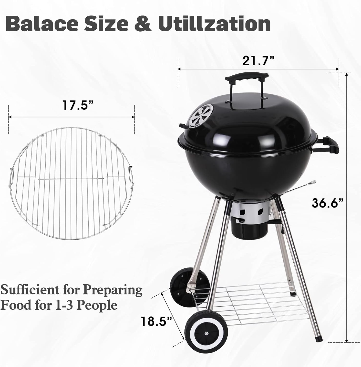Parrilla de Carbón Portátil: Parrilla de carbón portátil con dimensión de 18 pulgadas de diámetro por 36.6 pulgadas de alto. Una parrilla de kettle perfecta para llevar a cualquier lugar con mangos protectores y ruedas duraderas mejoradas para camping al aire libre, mientras sus amigos o familiares esperan alrededor de la parrilla, hambrientos por el tentador sabor a carbón de la comida asada
