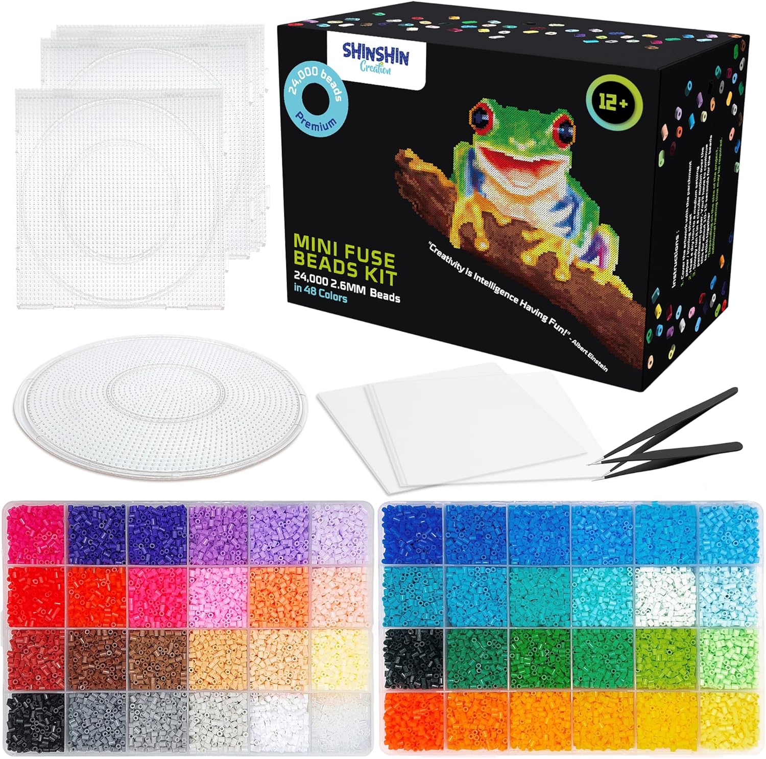 Kit de 24.000 Cuentas de Fusible Mini para Adultos - 48 Colores, Cuentas Pequeños de 2.6mm, 5 Tableros de Clavos, 2 Pinzas - Compatible con Hama, Melty Beads, Iron Beads Craft - Almacenamiento a Granel