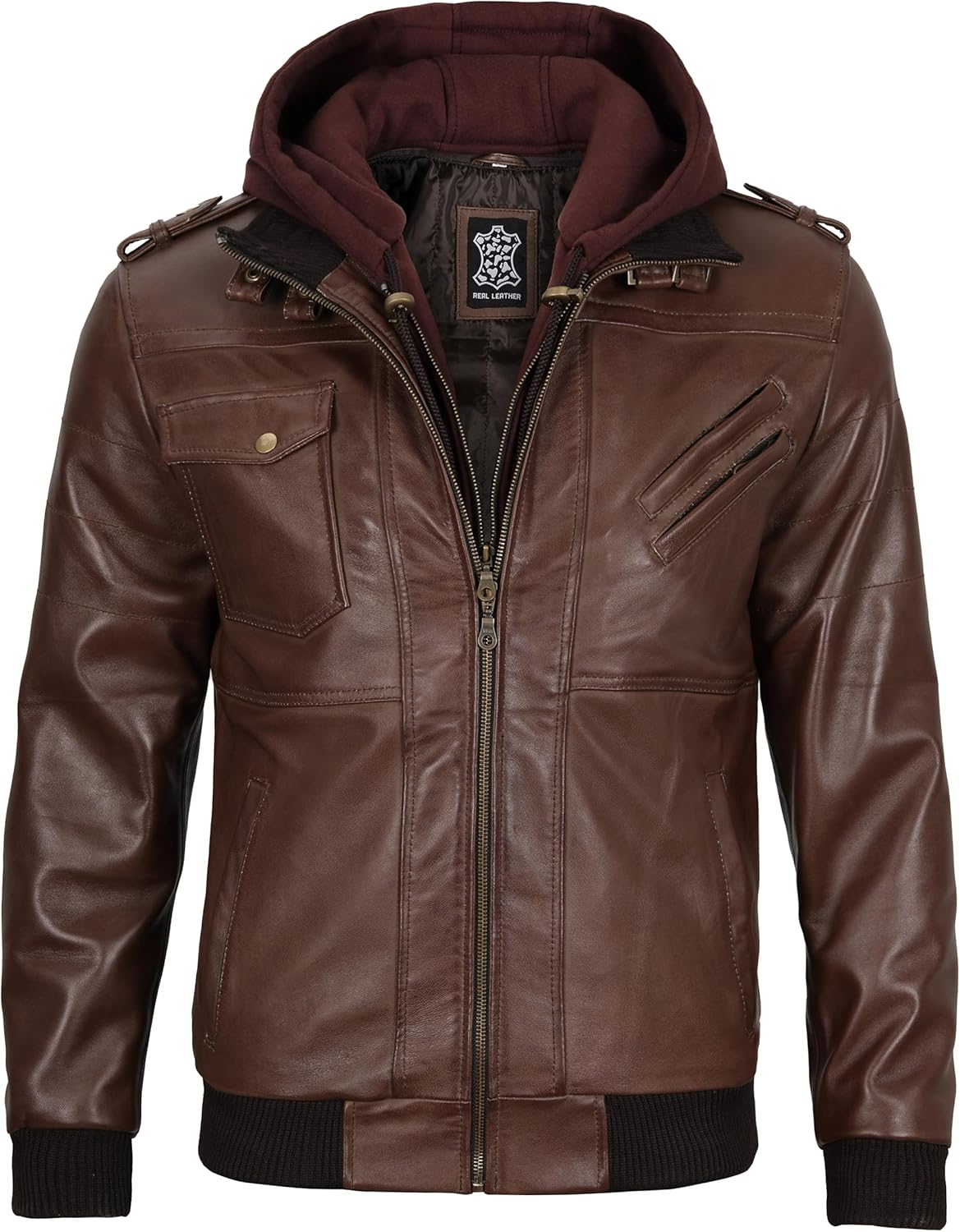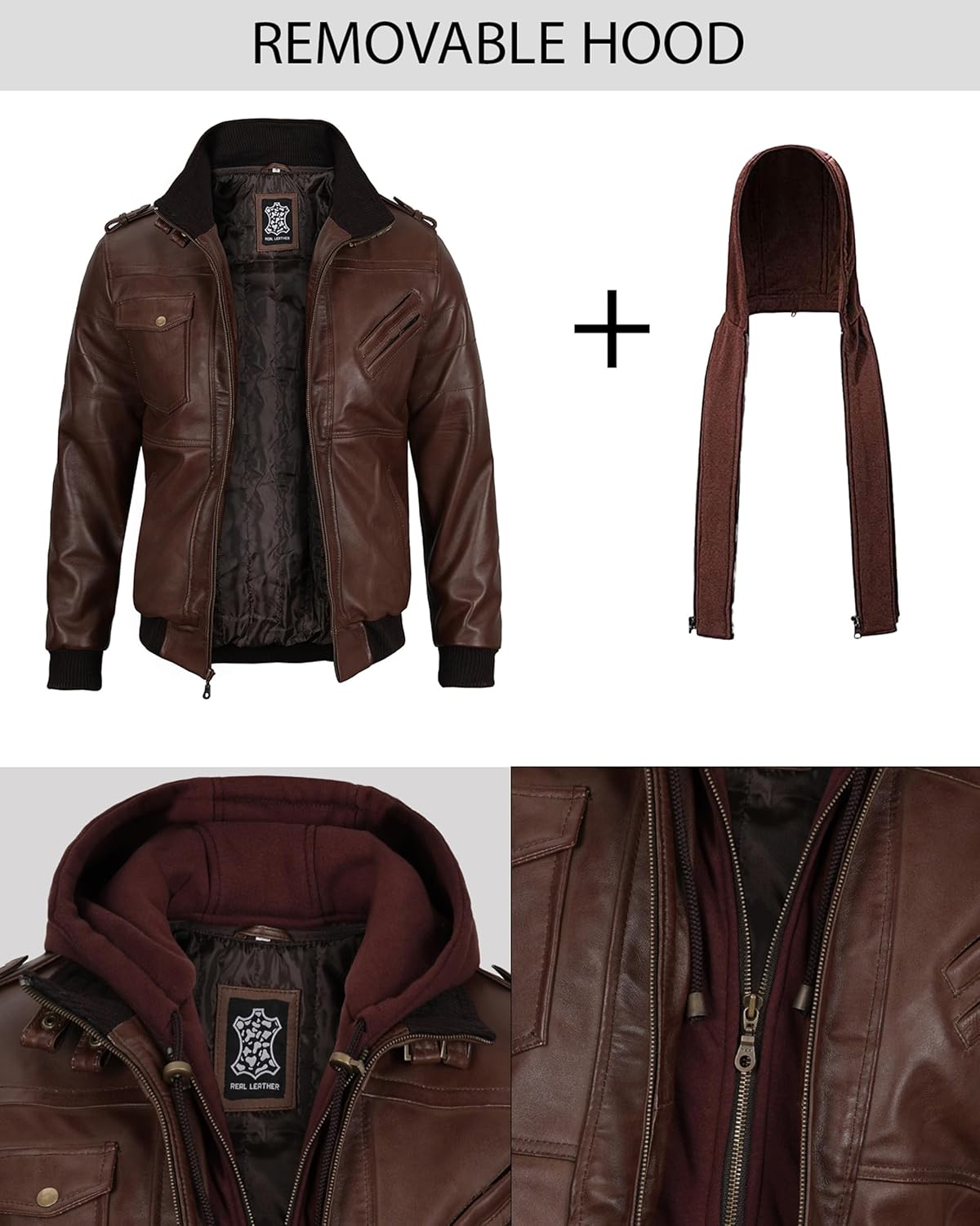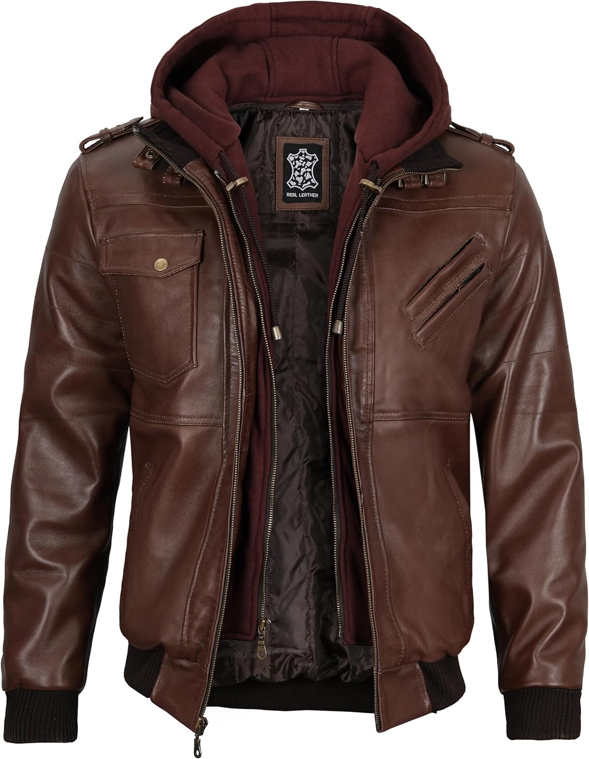 Chaquetas Bomber de Cuero Blingsoul para Hombre - Chaqueta de Cuero de Cordero Real con Capucha Desmontable