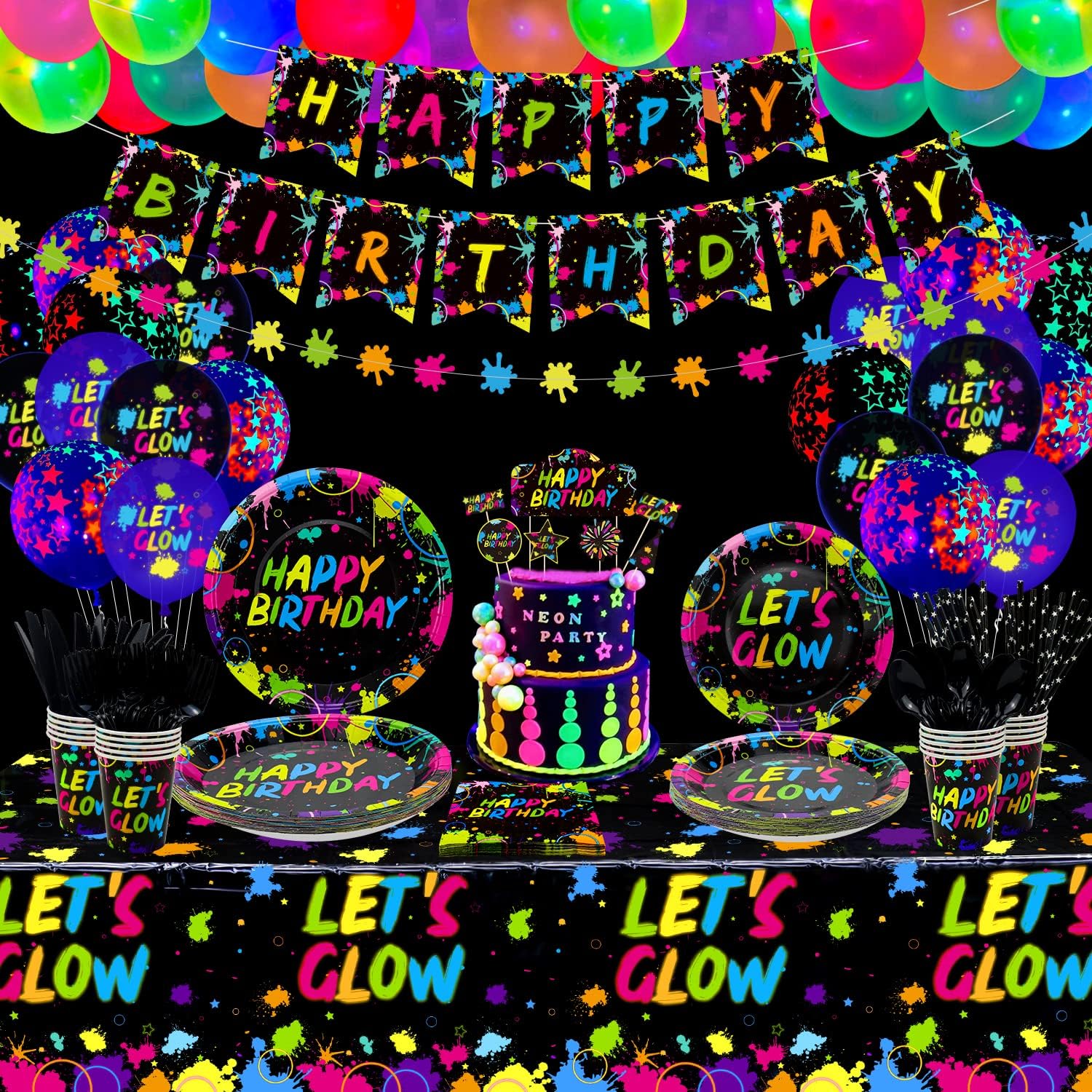 225 Piezas de Artículos de Fiesta Neon Fluorescente - Globo, Bandera de Cumpleaños, Guirnaldas, Topper de Pastel, Mantel, Platos, Servilletas y Taza para Decoraciones de Luz Negra, Sirve para 20 Invitados