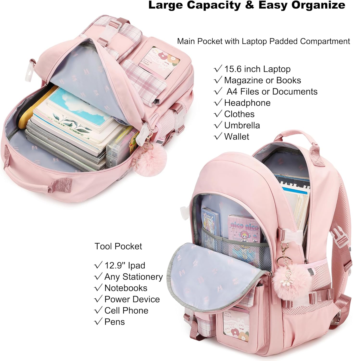 Mochila para Niñas, Mochila Escolar para Portátil de 15.6 Pulgadas, Mochilas para Colegio, Jardín de Niños, Primaria, Secundaria, Universitaria, Mochilas Grandes para Adolescentes, Niñas, Mujeres Estudiantes, Mochilas Casuales para Viajes (Rosa)