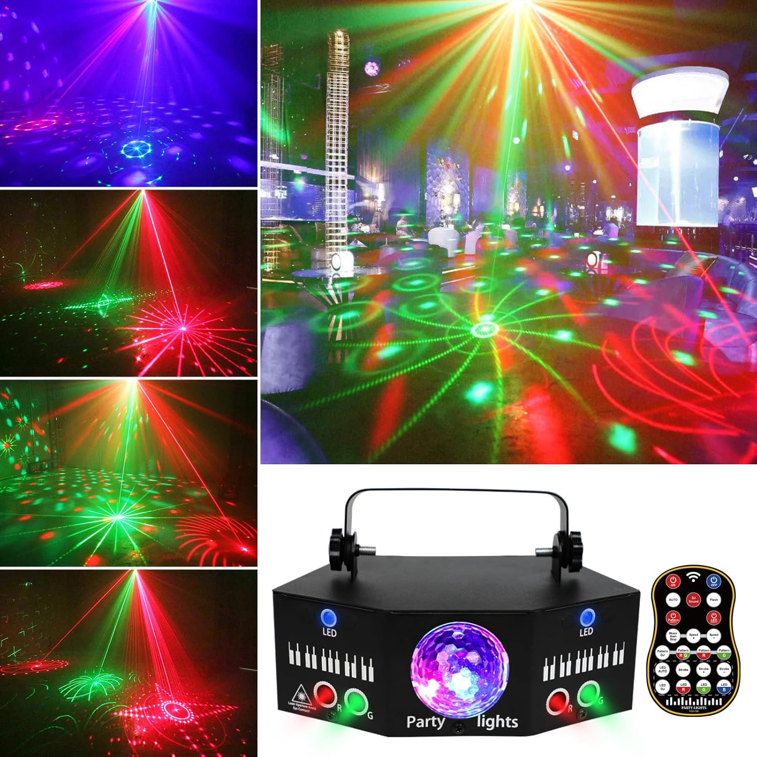 Luces de Fiesta + Bola de Discoteca, Iluminación de Escenario de DJ Estroboscópico 3 en 1 con Soporte DMX 512 Activado por Sonido con Control Remoto para Fiestas, Navidad, Club, Cumpleaños, Decoración para el Hogar