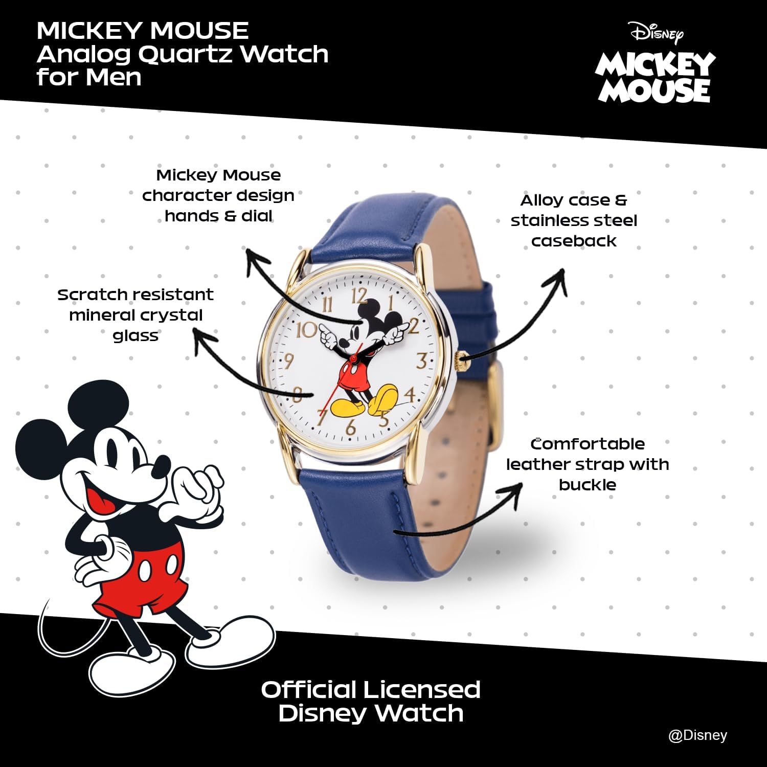Reloj Disney Mickey Mouse para Hombre - Relojes Mickey Mouse para Hombre - Reloj Clásico para Hombre - Regalo - Bisel Plateado - Correa de Cuero Coleccionable