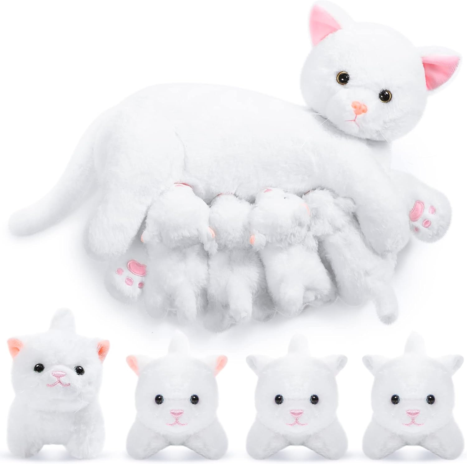Diseño Pensado: con suave pelaje, ojos brillantes y rostros expresivos, estos muñecos de peluche de gato tienen pequeños imanes en el vientre de la madre y en la nariz de cada gatita que las gatitas se acercarán a su madre tan pronto como estén cerca de su barriga