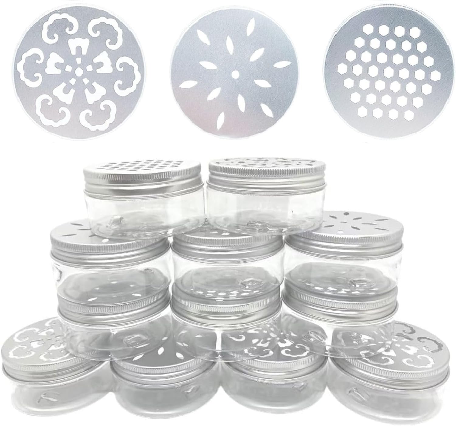 [Tapas Huecas]: Las tapas huecas de aluminio son para una fácil difusión de aromas, puedes poner perlas aromáticas, bicarbonato de sodio, aceites esenciales, aromas, sales de baño, purificadores de aire, perfume sólido. Hay 3 estilos lindos huecos, que son buenos para la decoración.
