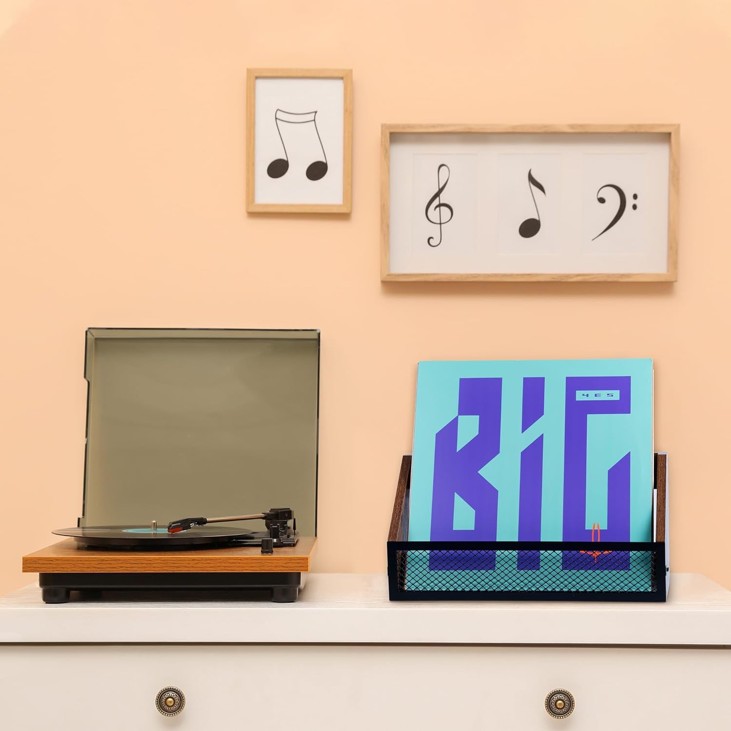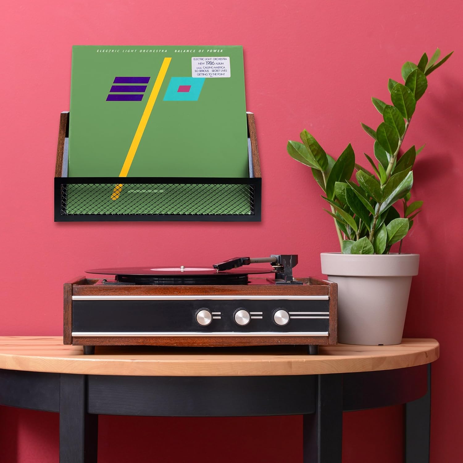 ESTILO RETRO: Nuestro expositor de discos de vinilo mostrará sus LPs en una pared o en la mesa del tocadiscos. Diseño delgado fabricado con madera duradera que se adapta fácilmente a cualquier decoración y añade estilo a su espacio.