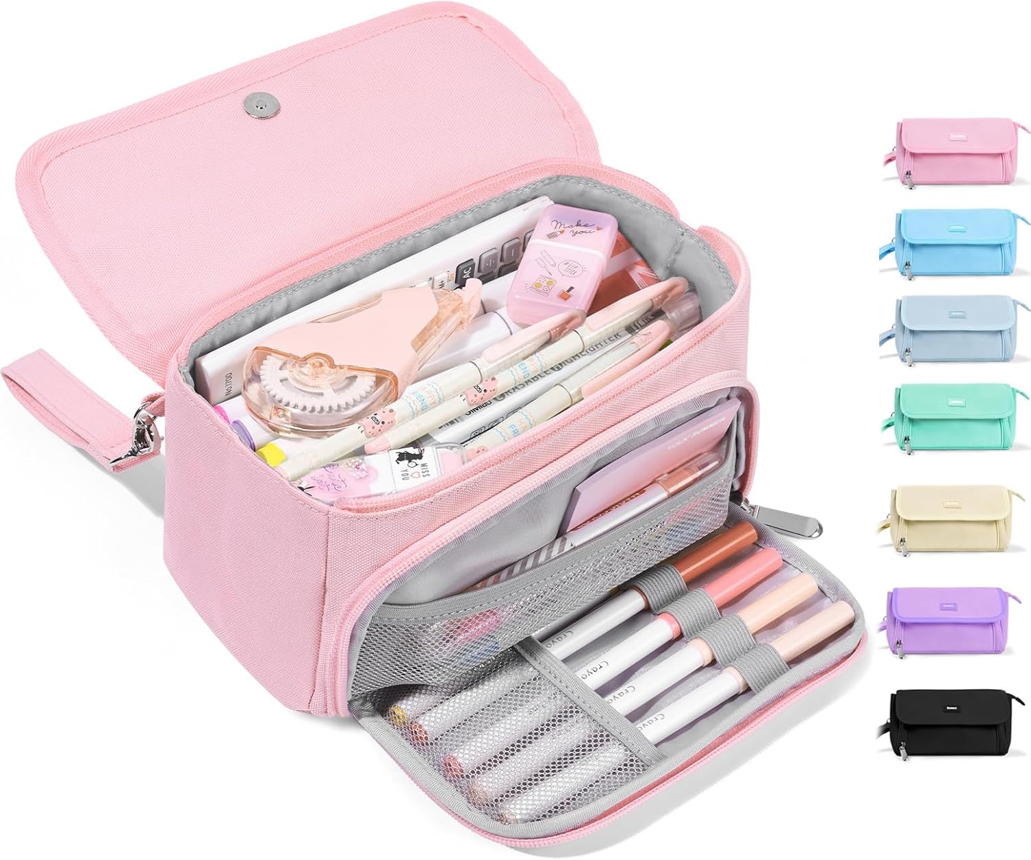 Estuche de lápices Sooez Super Large, Bolso de lápices de gran capacidad con 3 compartimentos, Capacidad para 200 lápices, Bolso de lápices lindo con cremallera, Bolso de artículos de papelería portátil, Artículos escolares estéticos para niñas, Rosa