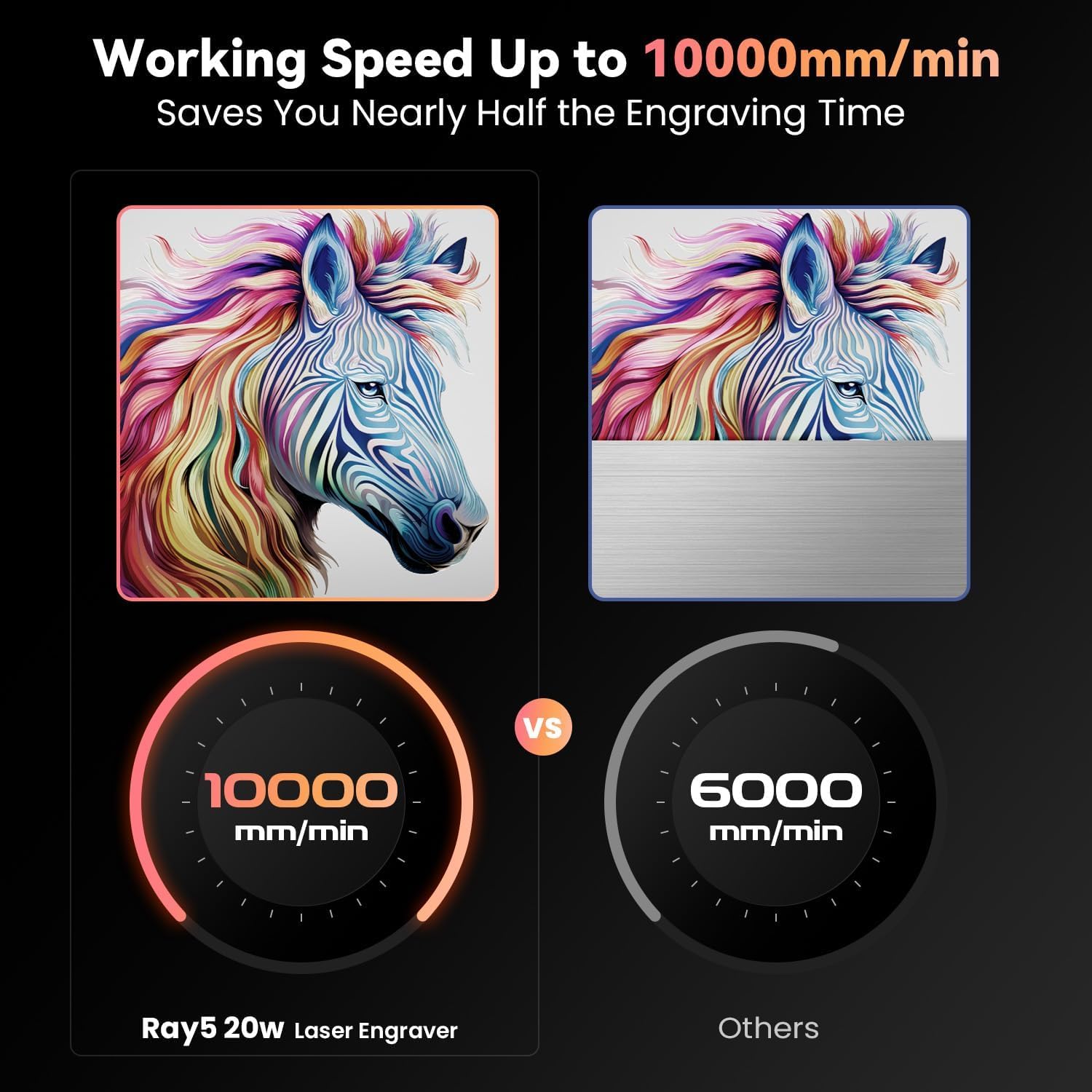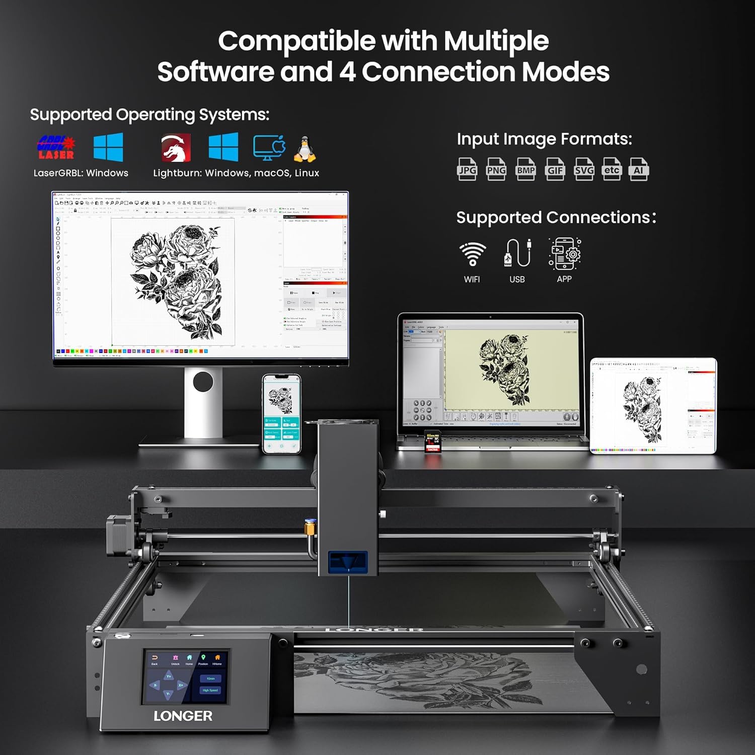 【Pantalla táctil de 3.5" y 4 opciones de conectividad】La RAY5 viene con una pantalla táctil de 3.5 pulgadas fácil de usar. Monitorea el progreso, ajusta la velocidad y más. Conéctate vía tarjeta SD, USB, aplicación o dirección IP del ordenador. Es compatible con software LaserGRBL y LightBurn, admitiendo BMP, JPG, PNG, DXF, AI, SVG y más.