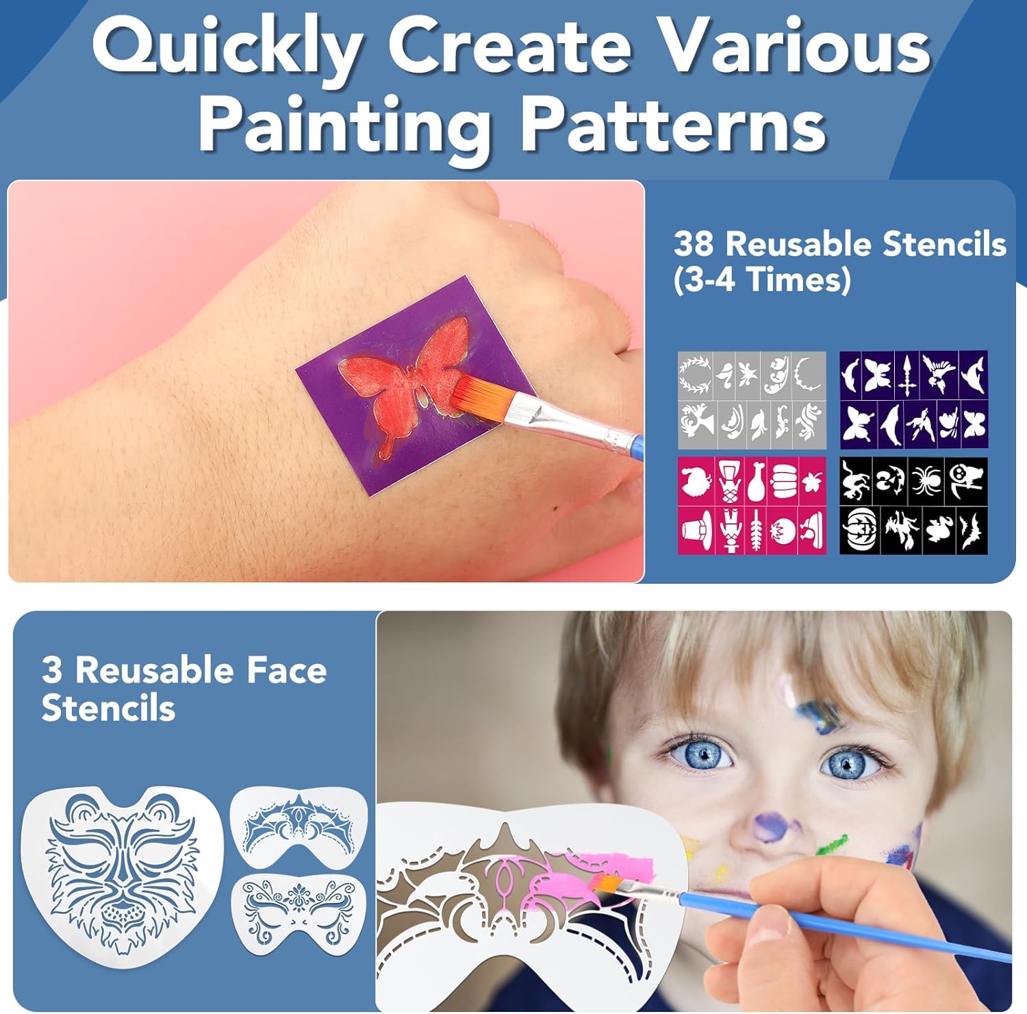 Kit de Pintura Facial para Niños de Fiesta, 22 Colores Kit de Pintura Facial Incluye Paletta, Esponjas, Pinceles y Plantillas, Kit Profesional de Pintura Facial No Tóxico para Niños y Adultos Maquillaje de Halloween