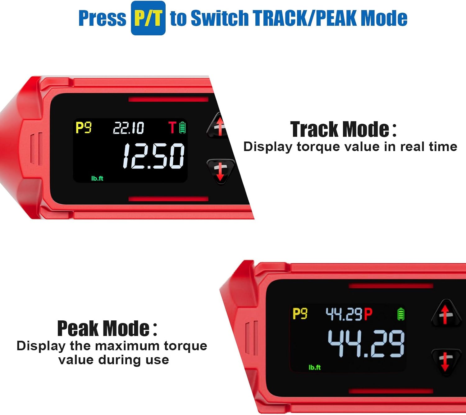 【Pantalla Grande de Colores】 Este juego de llave de torque electrónico tiene una pantalla grande y muestra fuentes en diferentes colores, lo cual es muy amigable para los trabajadores con poca visión y fácil de leer los datos. Dos modos de lectura (modo Pico/modo de seguimiento), adecuado para uso en una variedad de escenarios.