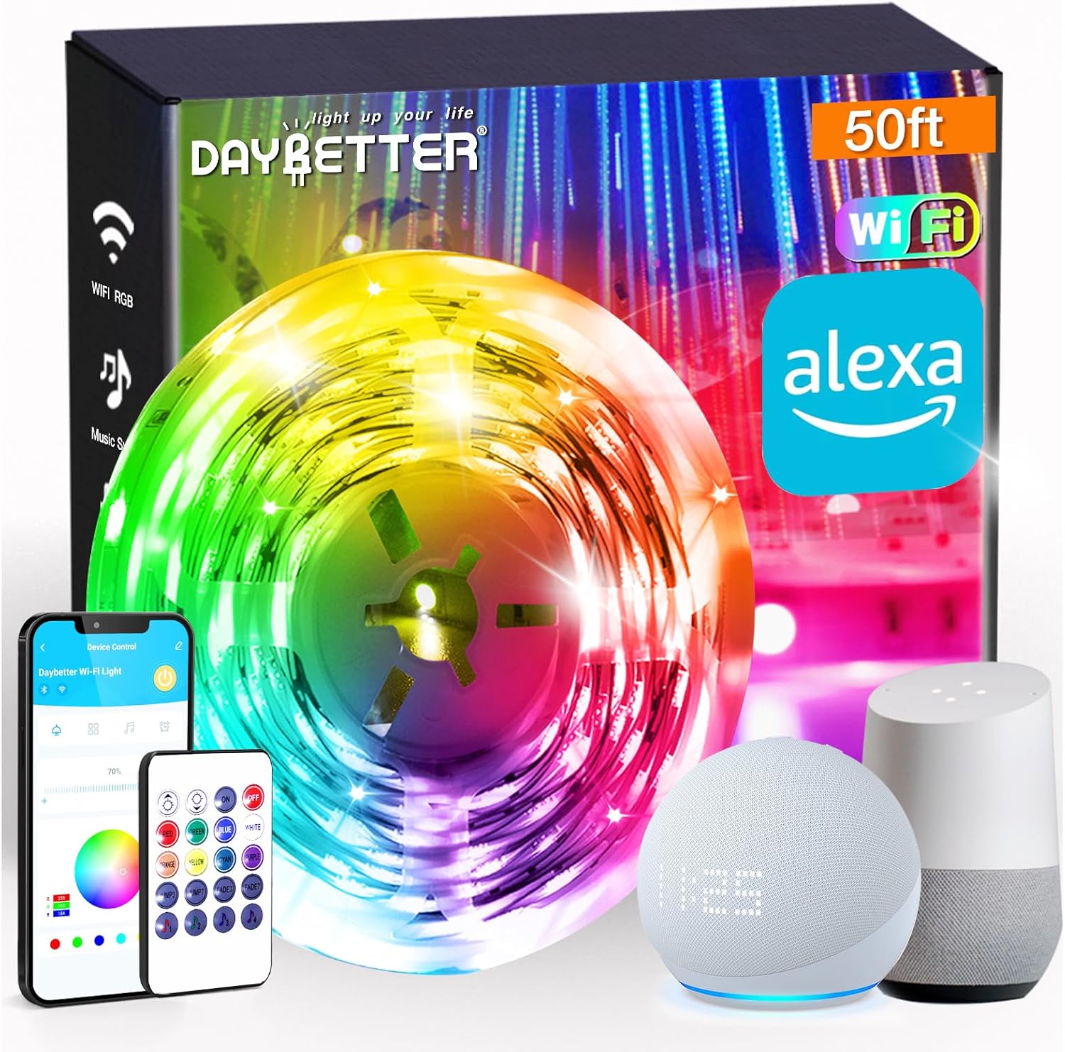 Luces LED Inteligentes Smart WiFi Controladas por Aplicación Compatibles con Alexa y Asistente de Google Programador de Tiempo Tira de Color RGB Cambiante Decoración para Dormitorio Fiesta Cocina 50ft