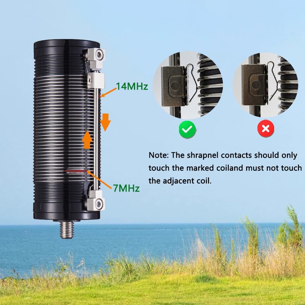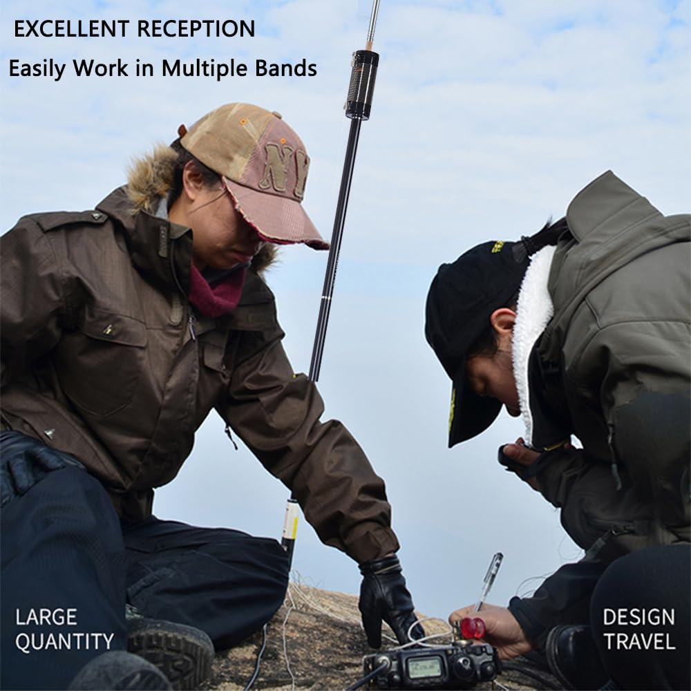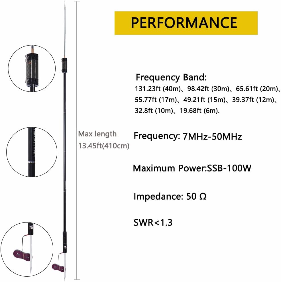 2: Frecuencia: Puede operar en 8 bandas de 131.23 pies(40m), 98.42 pies(30m), 65.61 pies(20m), 55.77 pies(17m), 49.21 pies(15m), 39.37 pies(12m), 32.8 pies(10m), y 19.68 pies(6m) (7MHZ-50MHz).Impedancia: 50Ω.Potencia máxima de SSB: 100W.El SWR de la banda de 131.23 pies(40m) es menor que 1.3, mientras que el SWR de otras bandas puede ajustarse a 1.1, permitiendo una relación de onda estacionaria estable y baja (SWR).Excelente para POTA/SOTA