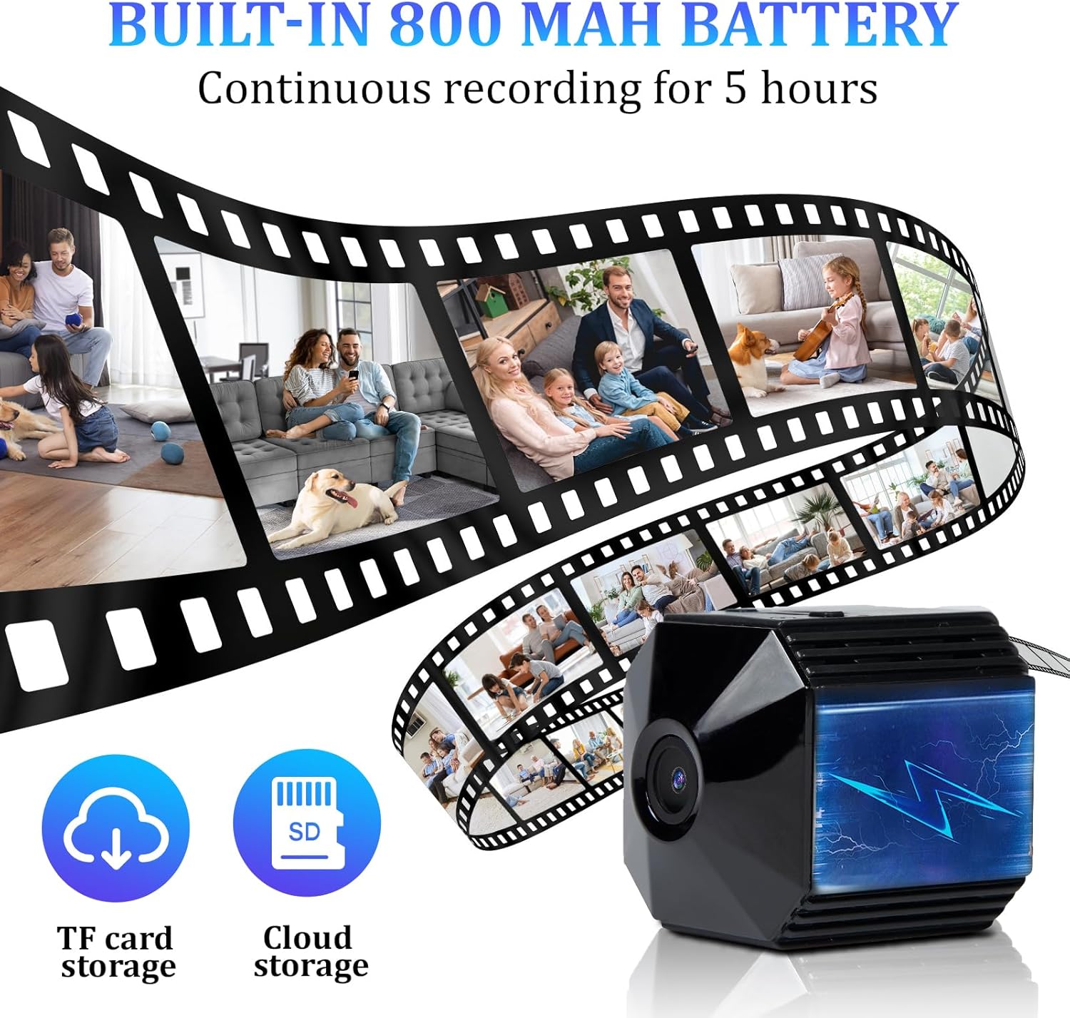 Sustainable Charging & Strongly Magnetic: Small camera is equipped with an 800mAh battery, which can work continuously for up to 300 minutes on a single full charge. Mini camera magnetic back can be easily placed on any metal surface, Equipped with 3M strong adhesive round iron sheet and a bracket, a charging cable (support mobile charging treasure charging) can be easily fixed to any place for shooting.