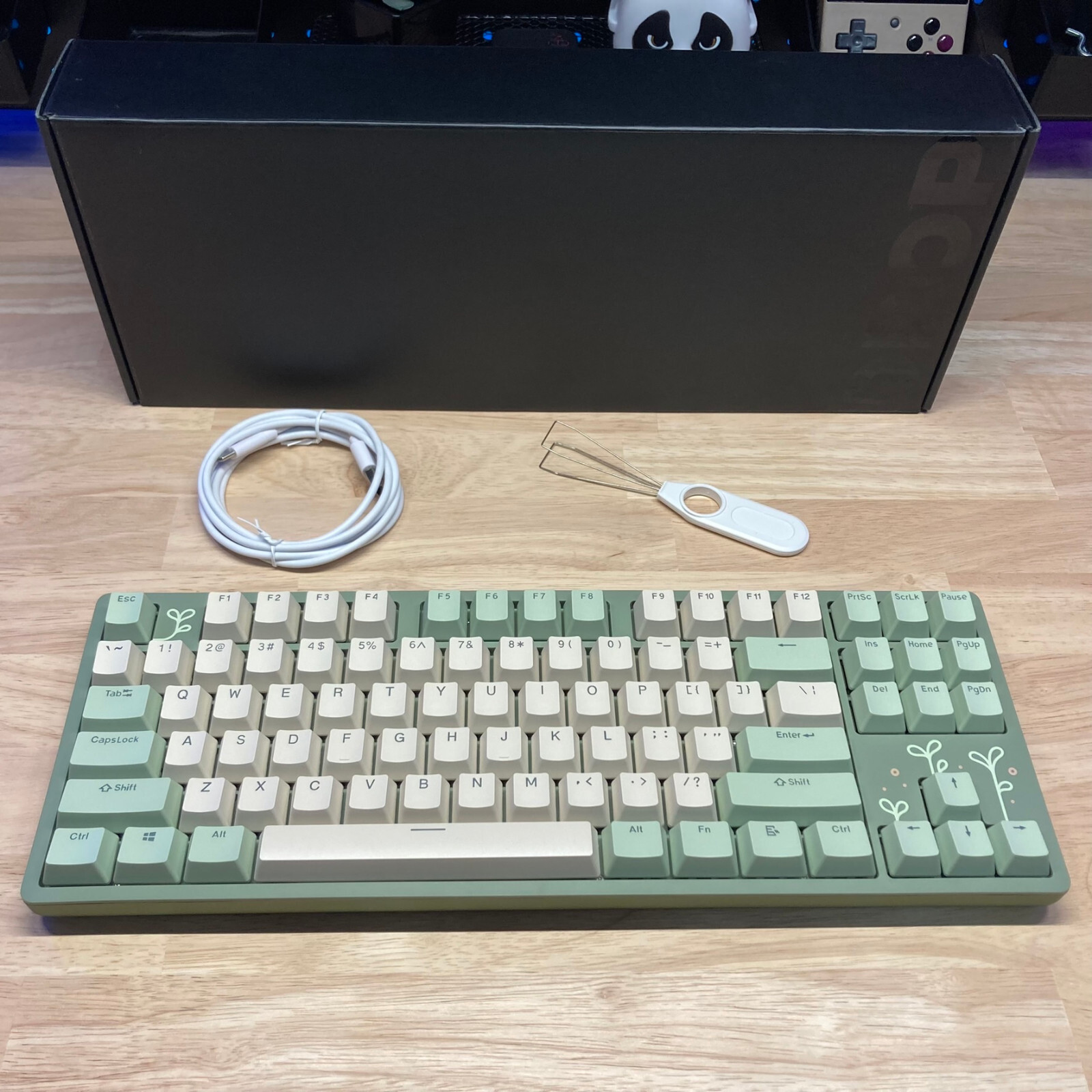 Holy Panda X Switches. Switches: Holy Panda X. More info from Drop Drop Phantom Stabilizers. Pad printed case artwork (Artwork by OSHETART). Case: Green ENTR anodized aluminum case. Layout: TKL.