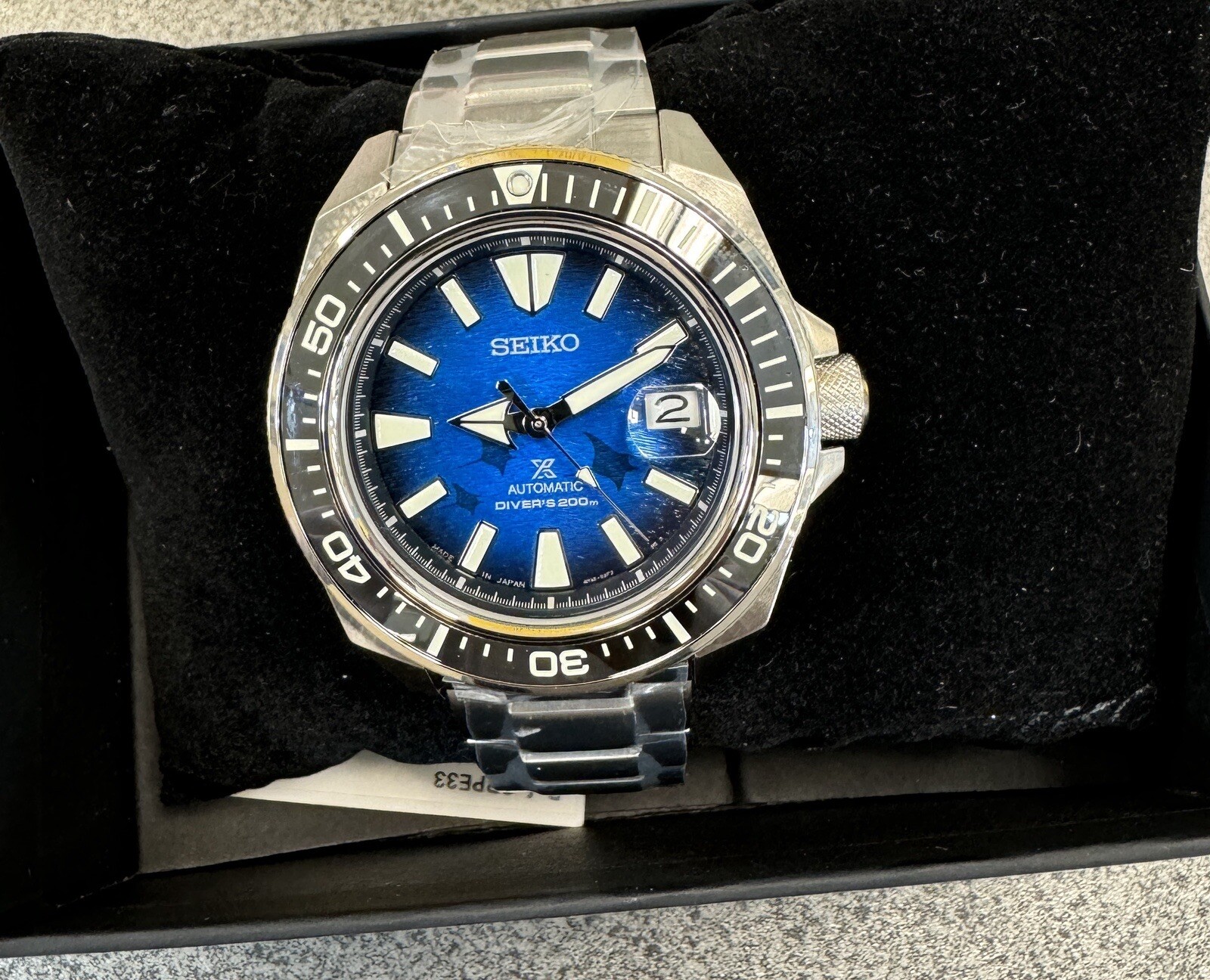 SEIKO Prospex Samurai Manta Ray Diver Automatic Watch Blue Dial SRPE33 NEW. Sapphire crystal with date magnifier. made in japan written on dial and back cover. Automatic with manual winding capacity.