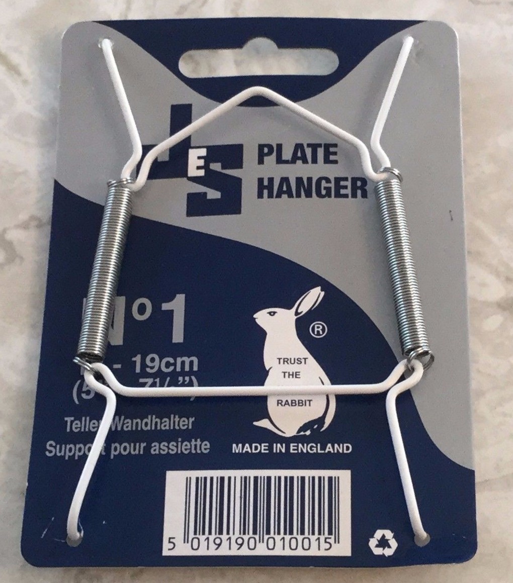 JES Plate Hanger. JES "Trust The White Rabbit". No.2 =7.5" - 11" Cardboard Display Size 3.5"x7.5" See pictures of hanger on 8" & 8.5" plate. White Vinyl Covered Wire with non Rust Galvanized Silver Color Springs.