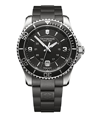 Victorinox 241698 Maverick Swiss Quartz Watch - 43mm Black Dial with Black Rubber Strap. Model: 241698. Series: Maverick. Dial: Black with Silver-Tone Luminous Hands & Markers. Strap: Black Silicone Rubber with Tang Buckle.