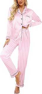 Womens Satin Pajama Set Classic Pattern Silky Pj Sets Button Down Sleepwear Loungewear