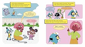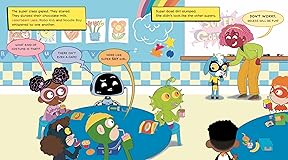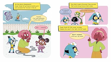 - A graphic picture book about a shy new kid in superhero school, who's not like any of the others, and has to figure out how not to feel so super-strange On Super Goat Girl's first day at her new school, she's met with stares. Laserbeam Lass, Robo Kid, and Noodle Boy don't know what to make of her—after all, what kind of a super has no swagger, and not even a cape? At recess, while the others have fun writing with lasers, doing lightning-fast math, and being super stretchy, Super Goat Girl doubts she can measure up. But when an army of evil aliens appears and ties up their teacher, Miss Damsel, it’s Super Goat Girl to the rescue—the only one who can chomp through the impossibly strong rope. She's sure she'll fit in now, but the other kids just seem confused—is chewing even a superpower? So maybe she's still not the right kind of super. At lunch, she gets another chance to prove herself when a giant gorilla crashes into the cafeteria and her supersonic bleat scares him away. But is being loud a superpower? Then the biggest test comes when the other kids accidentally create a black hole and Miss Damsel is sucked inside. This time when Super Goat Girl helps them save the day with her bravery and quick thinking, they begin to appreciate her. After all, almost every day calls for some superpowers—and they now realize that by sticking together, they’ll have the best chance of taking on anything that comes their way.