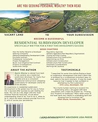 - THE EXPERT ADVICE YOU MUST HAVE FOR SUCCESS Specifically written with first-time developers in mind, as the author also once was, but also is valuable to established developers wanting to expand their knowledge about subdivision development and have a great reference source. The author’s expertise on subdivision development is based upon his two successful careers, personal development of residential subdivisions, and his professional consultant practice in land surveying, designing and obtaining approval of subdivisions for his developer clients. He is retired from both careers after nearly four decades in the former business, and three decades in the latter practice. You can obtain his insight and clarity on the numerous topics that make up the various steps to complete a successful, and financially rewarding subdivision project, even if it is your first subdivision. His book is special in that it begins with a most unique chapter, Chapter Zero,“How The Author BecameASubdivision Developer And MoreImportantly How You Can Also Do It,” the author’s personal account on becoming a developer. The chapter includes, “Why I Began As A SubdivisionDeveloper,” “Our First Subdivision,” “You Can Do It,” and “Begin Part-Time And Keep Your JobAndIncome.” Chapter Zero will encourage and motivate you to be confident in your ability to become a successful residential subdivision developer. Don't miss, "FROM the PUBLISHER", scroll past the other book ads.BOOK CHAPTERS How the Author Became a Developer Seeking A Property Planning & Moderating Development Costs Purchase Contract Professional Consultants Project Management Buyer Due Diligence Post Contract Property Investigations Subdivision Design Regulatory Agencies Advisory Agencies & Non-Regulatory Organizations Closing and Post Closing Infrastructure Pre-Construction Determining Lot Prices Infrastructure Construction Infrastructure Post-Construction Important Considerations Warning Be Cautious CHAPTER TOPICS (Partial List) Finding your first property Offer to purchase – important conditions Avoiding problems – what to investigate How a property can help pay development expenses How to get homebuilders as first lot buyers for early cash flow Finding the best consultants and land use attorney How to determine lot listing prices. Don't miss, "FROM the PUBLISHER", scroll past the other book ads. I assure you, it’s easier than you think to begin your first subdivision. The author did it.