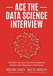 - COUNTERFEIT WARNING: Do NOT buy Used books - there is a 90% chance the 3rd party is selling pirated books filled with typos, missing SQL questions, and bad print quality. Only buy NEW! Authored by two Ex-Facebook employees, Ace the Data Science Interview is the best way to prepare for Data Science, Data Analyst, and Machine Learning interviews, so that you can land your dream job at FAANG, tech startups, or Wall Street.What's inside this 301 page book?201 real Data Science interview questions asked by Facebook, Google, Amazon, Netflix, Two Sigma, Citadel and more — with detailed step-by-step solutions!Learn how to break into Data Science, with tips on crafting your resume, creating kick-ass portfolio projects, sending networking cold emails, and better telling your story during behavioral interviewsQuestions cover the most frequently-tested topics in data interviews: Probability, Statistics, Machine Learning, SQL & Database Design, Coding (Python), Product Analytics, and A/B TestingEach chapter has a brief crash-course on the most important concepts and formulas to reviewLearn how to solve open-ended case study questions that combine product-sense, business intuition, and statistical modeling skills, and practice with case interviews from Airbnb, Instagram, & AccenturePraise for Ace the Data Science Interview:"The advice in this book directly helped me land my dream job" — Advitya Gemawat, ML Engineer, Microsoft“An invaluable resource for the Data Science & ML community”— Aishwarya Srinivasan, Senior Data Scientist, Google “Graduate students should read this book for a structured approach to prep for their next data Science interview” — Ali Gowani, Faculty at Northwestern University (MS in Data Science). “The authors explain exactly what hiring managers look for — a must read for any data job seeker”— Michelle Scarbrough, Former Data Analytics Manager, F500 Co."Super helpful career advice on breaking into data & landing your first job in the field"— Prithika Hariharan, President of Waterloo Data Science Club; Data Science Intern, Wish“FINALLY! Cracking the Coding Interview but for Data Science & ML!”— Jack Morris, AI Resident, Google“Solving the 201 interview questions is helpful for people in ALL industries, not just tech!”— Lars Hulstaert, Senior Data Scientist, Johnson & Johnson About Kevin Huo:Kevin Huo is currently a Data Scientist at a Hedge Fund, and previously was a Data Scientist at Facebook working on Facebook Groups. He holds a degree in Computer Science from the University of Pennsylvania and a degree in Business from Wharton. In college he interned at Facebook, Bloomberg, and on Wall Street. About Nick Singh: Nick Singh previously worked on Facebook’s Growth Team and at SafeGraph, a geospatial analytics startup. Currently, he runs SQL interview platform DataLemur.com and shares career tips on LinkedIn to his 120,000+ followers. Nick holds a degree in System Engineering with a minor in Computer Science from the University of Virginia. In college, he interned at Microsoft and at Google’s Nest Labs on the Data Infrastructure Team.