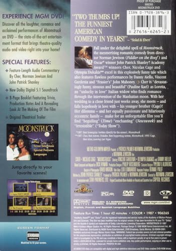 Fall under the delightful spell of Moonstruck, the mesmerizing romantic comedy from director Norman Jewison (Fiddler on the Roof) and OscarÂ(r) winner* John Patrick Shanley. Academy AwardÂ(r) winners** Cher, Nicolas Cage and Olympia Dukakis excel in this explosively funny tale which also features flawless performances by Danny Aiello, Vincent Gardenia and Frasier's John Mahoney. Cher is "devastatingly funny, sinuous and beautiful" (Pauline Kael) as Loretta, an unlucky in love Italian widow who finds romance through the intervention of the Manhattan moon. With her wedding to a close friend just weeks away, she meets and falls hopelessly in love with his younger brother (Cage)! Her dilemma and her equally passionate and hilariously eccentric family make for an unforgettable film you'll find "beguiling" (Time), "enchanting" (Newsweek) and "irresistible" ("Today Show").