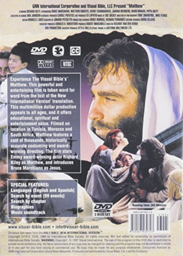 Experience The Visual Bible's Matthew. This powerful and entertaining film is taken word for word from the text of the New International Version translation. This multi-million dollar production appeals to all ages, and it offers educational, spiritual and entertainment value. "The goal of The Visual Bible is to put the entire Bible on film using only Scripture to tell the story." Filmed on location in Tunisia, Morocco and South Africa, Matthew features a cast of thousands, historically accurate costuming and award-winning directing. The film stars Emmy award-winning actor Richard Kiley as Matthew, and introduces Bruce Marchiano as Jesus.