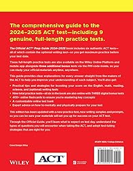 - THE OFFICIAL ACT® PREP GUIDE 2024–2025The comprehensive guide to the 2024–2025 ACT test―including 9 genuine, full-length practice tests.The Official ACT® Prep Guide 2024–2025 book includes six authentic ACT tests―all of which contain the optional writing test―so you get maximum practice before your test date.These full-length practice tests are also available on the Wiley Online Platform and mobile app alongside three additional bonus tests via the PIN code inside, so you can study your official materials anytime, anywhere.This guide provides clear explanations for every answer straight from the makers of the ACT to help you improve your understanding of each subject. You’ll also get:Practical tips and strategies for boosting your score on the English, math, reading, science, and (optional) writing testsNine total practice tests―all six in the book are also online with THREE digital bonus tests400+ online flashcards to ensure you’re mastering key conceptsA customizable online test bankExpert advice on how to mentally and physically prepare for your testThis edition has been updated with a new practice test, new writing samples and prompts, so you can be sure your materials will set you up for success on your ACT test.Through the Official Guide, you’ll learn what to expect on test day, understand the types of questions you will encounter when taking the ACT, and adopt test-taking strategies that are right for you.
