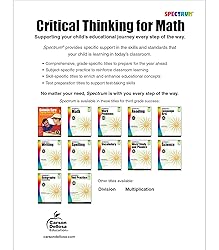 - Critical Thinking Math Grade 3 workbook for kids ages 8+Support your child’s educational journey with Spectrum’s 3rd Grade Critical Thinking Math Workbook that teaches essential 3rd grade math skills.3rd grade Critical Thinking Math workbooks are a great way for 3rd graders to learn critical thinking skills such as multiplication and division, fractions, geometry, and more through a variety of learning activities that are both fun AND educational! Why You’ll Love This Math Book for 3rd GradersEngaging and educational 3rd grade math activities. “Using a number line”, “Graphing”, and “Adding and subtracting through 4-digit numbers” are a few of the fun math activities that incorporate critical thinking for kids to help inspire learning into your child’s classroom or homeschool curriculum.Tracking progress along the way. “Check what you know” and “Check what you’ve learned” sections are included at the beginning and end of every chapter. A mid-test and final test are also included in the Spectrum math book to test student knowledge. Use the answer key to track student progress before moving on to new and exciting activities.Practically sized for every activity. The 128-page math workbook is sized at about 8 ½ inches x 11 inches―giving your child plenty of space to complete each exercise.About Spectrum For more than 20 years, Spectrum has provided solutions for parents who want to help their children get ahead, and for teachers who want their students to meet and exceed set learning goals―providing workbooks that are a great resource for both homeschooling and classroom curriculum.The Spectrum Grade 3 Math Workbook Contains:6 chapters of math activitiesMid-test, final test, and answer key“Check what you’ve learned” and “Check what you know” reviews