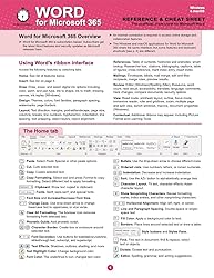 - This top-rated Microsoft Word cheat sheet can help anyone just getting started with Word for Windows PCs or Word for Mac, as well as students, office workers, and home users who need a refresher for new versions of Office for Microsoft 365.The four-panel Word for Microsoft 365 Reference & Cheat Sheet contains Word tips, examples, and keyboard shortcuts (Windows/macOS). Most instructions and examples also apply to Word 2024 and earlier versions of the software. Topics include:What the various ribbons in Word for Microsoft 365 doAnnotated list of the Word for Microsoft 365 Home ribbon buttonsAdding images, shapes, text boxes, media, and other elementsInserting headers, footers, charts, page numbers, and moreCreating and saving documentsFormatting text, and working with MS Word Styles and ThemesHow to export .rtf, .txt, .doc and PDF filesHow to add a footnote, endnote, index, and table of contents to a Word documentHow to adjust margins or orientation for printingFinding and replacing textKeyboard shortcuts for both Windows and Mac usersThe four-panel reference is printed on 8.5 by 11 inch high-quality card stock, perfect for desks, walls, and shelves. It has holes for three-ring binders. Fully recyclable and designed for readability.The Word for Microsoft 365 Reference and Cheat Sheet was created by the publisher of the award-winning IN 30 MINUTES guides and is based on Microsoft Word In 30 Minutes.