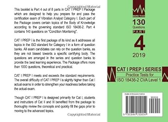 - This book is Part 4 of CAT I PREP I Package(8 parts) which is designed to help you prepare for and pass Vibration Analyst Category I certification exam. Each part covers certain topics of the Body of Knowledge according to ISO 18436-2 standard.The questions are arranged in the Package to provide the best learning experience. Part 4 contains 140 questions on 'Condition Monitoring'. CAT I PREP I is the first package of its kind. It addresses all topics in the ISO standard for Category I in a form of question banks. All exam candidates can rely on the question banks, as the package is not biased towards a specific certifying body. The package offers more than 1000 questions. CATI PREP I meets and exceeds the standard requirements. The overall difficulty of Cat I Prep Iis a bit higher than Cat I actual exams in order to strengthen your readiness before taking the actual exam.