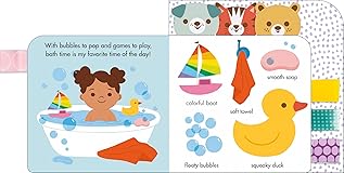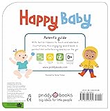 - Happy Baby is a wonderful new gift book for babies by Priddy Books. This shaped board book is a wonderful gift for any baby shower or to give to a newborn baby. It has been designed with our very first learners in mind, as each page has a ribbon attached with a different pattern or tactile feel which babies can explore as they interact with the book. There are also three shaped animal tabs which will also engage young children as they turn the pages. This book is focussed on different types of play, from toys to playing outside and doing arts and crafts together. The soft retro illustrations include sweet vignettes of babies and labelled images of what is in the scene to encourage early speaking skills, word-picture recognition as well as introducing babies to the world around them. There is also gentle rhyming text written from a child’s perspective which is perfect for reading aloud to young children: I can shake my rattle, bang my drum, and stack up blocks one by one! There is so much for babies and parents to explore together as they enjoy this adorable baby book.
