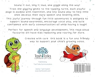 - Tiny Talkers: Sound Play for Growing Voices is a vibrant, research-informed picture book written by a speech pathologist to support early sound development in children aged 2-6.Each playful page features a colourful character - from the giggling gecko, rainy rainbow to the tapping turtle - offering repetition, and sound play that sparks speech sounds and encourages connection with caregivers.Whether your child is just beginning to explore sounds or has a reduced speech sound inventory, Tiny Talkers - Sound Play for Growing Voices invites families, educators, and therapists to model and enjoy sound-rich moments that build confidence, communication and moments for connection.Perfect for: Parents of toddlers and preschoolersSpeech pathologists supporting sound stimulability Educators seeking inclusive, engaging communication resourcesChildren who thrive through play-based strategies