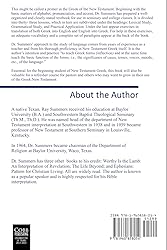 - This might be called a primer in the Greek of the New Testament. Beginning with the basic matters of alphabet, pronunciation, and accent, Dr. Summers has prepared a well-organized and clearly stated textbook for use in seminary and college classes. It is divided into thirty- three lessons, which in turn are subdivided under the headings: Lexical Study, Grammatical Study, and Practical Application. Under the last appear exercises in translation of both Greek into English and English into Greek. For help in these exercises, an adequate vocabulary and a complete set of paradigms appear at the back of the book. Dr. Summers’ approach to the study of language comes from years of experience as a teacher and from his thorough proficiency in New Testament Greek itself. It is the author’s intention and practice "to teach Greek forms (inflection) and at the same time teach the basic function of the forms, i.e., the significance of cases, tenses, voices, moods, etc., of the language.” Essential for the beginning student of New Testament Greek, this book will also be valuable for a refresher course for pastors and others who may want to grow in their use of the Greek New Testament.
