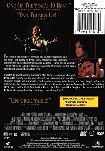 Few times in the history of Hollywood has a film been released with the scope and daring of EVITA! Now, experience this landmark achievement as entertainment megastar Madonna -- in the role of a lifetime -- joins Antonio Banderas (ASSASSINS, DESPERADO) for the year's most talked about motion picture event! Directed by award-winning filmmaker Alan Parker (MISSISSIPPI BURNING), EVITA is the riveting true-life story of Eva Peron (MADONNA), who rose above childhood poverty and a scandalous past to achieve unimaginable fortune and fame. Despite widespread controversy, her passion changed a nation forever! Winner of the coveted Academy Award(R) for Best Song (1996) and 3 Golden Globe Awards (Best Picture, Best Actress, and Best Song) -- critics nationwide hailed EVITA as a triumphant must-see masterpiece -- and so will you!