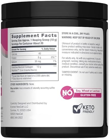 NeoCell Super Collagen Peptides Powder está especialmente formulado para apoyar su belleza radiante desde adentro y promover la producción de colágeno propio de su cuerpo (1). Con colágeno bovino tipos 1 y 3, este polvo de colágeno le da a su cuerpo los bloques de construcción que necesita para crear su propio colágeno y otras proteínas como la queratina, que se encuentra en las uñas y el cabello (1). El polvo de colágeno NeoCell contiene colágeno hidrolizado o colágeno descompuesto en moléculas más pequeñas, llamadas péptidos, que se absorben fácilmente y son biodisponibles para el apoyo de la piel, el cabello, las uñas y las articulaciones (1). Testado IGEN Non-GMO (2), este polvo de proteína de colágeno con sabor vainilla francesa es apto para keto, sin gluten y no contiene soja, lactosa, maíz, almidón ni sabores artificiales. Disuelva dos cucharadas diariamente en su bebida favorita. Desde 1998, NeoCell ha estado siguiendo la ciencia. Los primeros estudios sobre el colágeno y su papel en la salud de la piel y las articulaciones fueron suficientes para comenzar y hemos estado al paso, si no por delante, de la ciencia desde entonces. (1) Estas declaraciones no han sido evaluadas por la Administración de Alimentos y Medicamentos. Este producto no está destinado a diagnosticar, tratar, curar o prevenir ninguna enfermedad. (2) Este producto no contiene genes o proteínas GE comunes. Visite el sitio web de Certifications by Nutrasource.