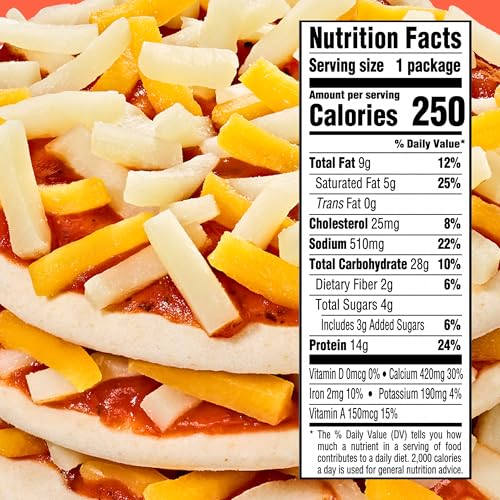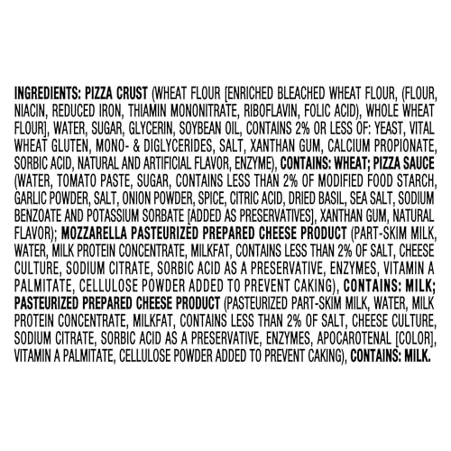 • Contains pizza crust, pizza sauce, mozzarella pasteurized prepared cheese product and pasteurized prepared cheese product