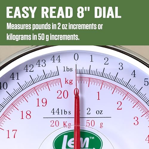 - Easy to Use: This scale has a large 8" dial to make the weight easier to see. Our scale measures pounds in 2-ounce increments or kilograms in 50-gram increments. Includes zeroing adjustment knob.