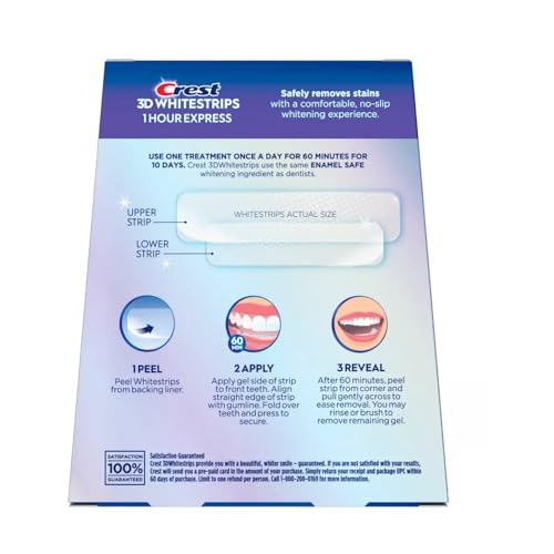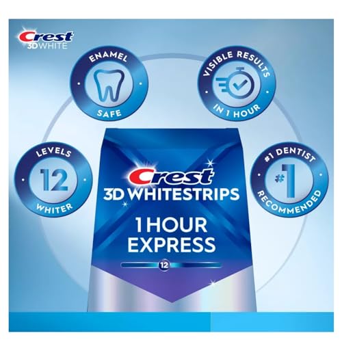 ¿Necesitas blanquear tus dientes rápidamente en casa? No importa cuál sea la ocasión, todo lo que necesitas es 1 hora para eliminar años de manchas en los dientes. Fabricado por la marca #1 de blanqueamiento dental casero recomendada por los dentistas, Crest 3DWhiteStrips 1-Hour Express te proporcionará una sonrisa 100% más blanca y visible, lo que te garantizamos. Este tratamiento de blanqueamiento dental casero seguro para el esmalte hará que tu sonrisa quede 12 niveles más blanca en solo 10 días. Además, el agarre cómodo y antideslizante de la tecnología Advanced Seal se mantiene en su sitio, por lo que puedes hablar, beber agua y charlar con tus amigos incluso mientras te blanqueas los dientes. Solo tiene que aplicar Crest 3DWhiteStrips 1-Hour Express durante 60 minutos al día durante 10 días. Este paquete incluye 20 tiras blanqueadoras de dientes, 10 para los dientes superiores y 10 para los inferiores, que se utilizarán en el transcurso de 10 días.