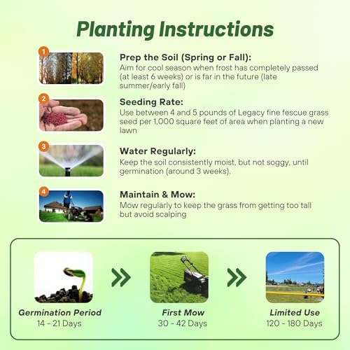 - REVESTIMENTO OPTIGROWTH PARA MEJOR GERMINACIÓN: El avanzado revestimiento OptiGrowth en esta semilla de césped garantiza un contacto superior entre la semilla y el suelo, resultando en una distribución uniforme y una germinación más rápida y confiable. Este revestimiento hace que la mezcla Legacy sea una opción premium para áreas difíciles de cultivar, ya sea que esté plantando semillas de césped para sombra densa o césped soleado.