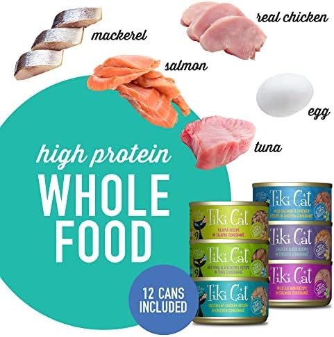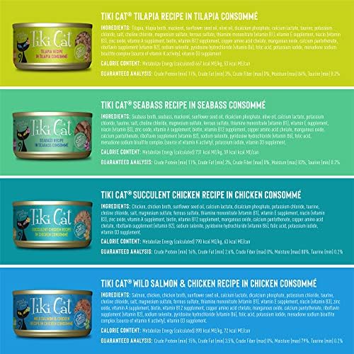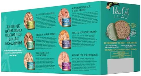 our cat is a carnivore, so treat her to the delicious protein and meat she craves with Tiki Cat Luau wet cat food. Boasting high protein and grain free ingredients, each bite of our canned food includes a savory consommé and chicken and fish flavors to turn any meal into a party. Count on our cat food to give your cat the balanced and complete nutrition your pet needs for each of her life stages. Plus, the high moisture content gives your cat the supplemental water they need for good hydration. Each can of our protein-rich cat food includes real fish, real meat and whole nutrition, with real tilapia as the first ingredient. Plus, you and your cat will both enjoy these benefits in every can of our nutrient rich cat food: No by-products or fillers Grain-free and low or no carbohydrates Real, natural ingredients to promote healthy skin, coat, digestion and more Great taste for finicky felines Balanced meal and ideal nutrition for all life stages See the difference that Tiki Cat makes, and give your cat the nutrition she needs and the flavor she craves. Analysis For nutrition information, see individual products: -Hoboken Luau - Ahi Tuna & Chicken in Chicken Consommé Hanalei Luau-Wild Salmon in Salmon Consommé Koolin Luau- Chicken with Egg in Chicken Consommé Pukka Luau- Succulent Chicken in Chicken Consommé Papeekeo Luau- Ahi Tuna & Mackerel in Tuna Consommé Napoli Luau- Wild Salmon & Chicken in Chicken Consommé Feeding Guidelines Varies based on age, activity and lifestyle. For adult cats: 2. 8 oz. can: 1-2 cans per 7 lbs. bodyweight For kittens, offer food several times a day, feed up to twice this amount. Pregnant or nursing cats may require two to four times their normal feeding. The amount to feed will vary based upon age, activity level, breed, size, and environment. Please use the feeding guidelines as an initial recommendation and adjust food amount as needed to maintain proper weight. Always provide access to clean, fresh water. Canned food should be changed at least twice daily in order to prevent spoilage. Serve at room temperature, and refrigerate any unused portion.