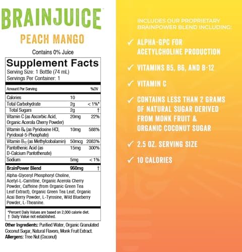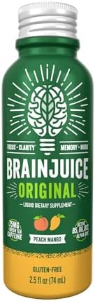 BrainJuice Brain Support Shot, Gluten Free Supplement Shots for Energy & Focus, Healthy Drinks with Alpha GPC, Vitamin B & Organic Green Tea Extract Caffeine, Peach Mango, 2.5 fl oz, 12 Pack