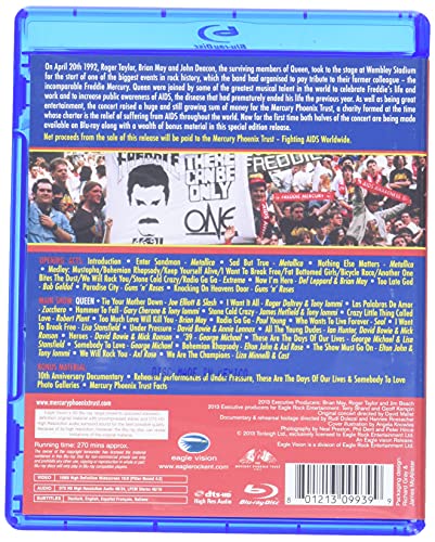 Prensado de Blu-ray. El 20 de abril de 1992, Roger Taylor, Brian May y John Deacon, los miembros supervivientes de Queen, subieron al escenario del estadio de Wembley para dar inicio a uno de los eventos más importantes de la historia del rock, que la banda había organizado para rendir homenaje a su antiguo colega, el incomparable Freddie Mercury. A Queen se unieron algunos de los mejores talentos musicales del mundo para celebrar la vida y la obra de Freddie y aumentar la conciencia pública sobre el SIDA, la enfermedad que había acabado prematuramente con su vida el año anterior. Además de ser un gran entretenimiento, el concierto recaudó una enorme y creciente suma de dinero para Mercury Phoenix Trust, una organización benéfica creada en ese momento y cuyo estatuto es ayudar a las personas que sufren el SIDA en todo el mundo. Ahora, por primera vez, las dos mitades del concierto estarán disponibles junto con material adicional en esta edición especial.