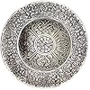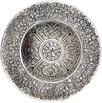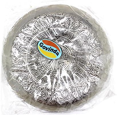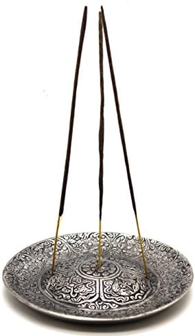 El Quemador de Incienso de Estilo Tibetano Govinda mide 6" de diámetro. La placa está decorada con patrones florales en espiral que cubren su base de tono plateado. Es una pieza llamativa con ranuras para hasta 5 palitos, el borde cóncavo mantiene las cenizas contenidas. Hecho de aleación de aluminio reciclado pesado. Dado que el producto es de aluminio reciclado, el color y el brillo pueden variar. Úselo para incienso en palitos y conos, o para incienso japonés o en espiral usando un soporte de cerámica en la parte superior. También se puede usar con carbón si se agrega una capa a prueba de calor adecuada debajo, pero tenga cuidado ya que se calentará mucho. Consejo: Si el incienso en palitos no se mantiene lo suficientemente derecho, rompa el palillo al comienzo del incienso, el poco incienso lo mantendrá estable. Govinda y su logotipo son una marca registrada