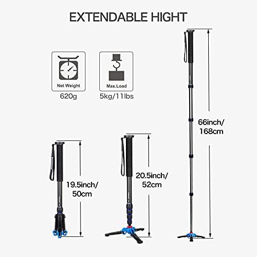 • The monopod is made of high quality aluminum, which is lighter in weight.The 5-section can extend height 19.5 inch to 65inch,weight only 1.36Ibs and max load 11Ibs. This video monopod kit is perfect for sporting events, travel and outdoor shooting.