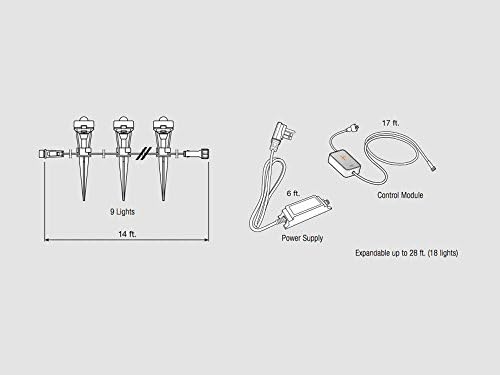 • Wet rated for outdoor use: Starter Kit contains power supply, control module and 9 Gardenspot lights for up to 14 feet of total coverage; Maximum suggested length is 28 total feet (via extension kits, sold speratately); Removable stakes for mounting on decks, siding, etc
