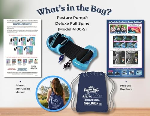 - WHAT'S IN THE BAG? (1) POSTURE PUMP Relief For Neck and Back Pain - Deluxe Full Spine Model 4100-S (Single Air Cell Cervical) DISC HYDRATOR [No plastic wrapping – less waste and environmentally friendly!], (2) Printed Instructions, (3) Product Brochure. Comfort Pad is designed to stretch & fit ALL body types, while the new Comfort Visor gently molds to the shape of the forehead (no chin or jaw contact/NO CHIN STRAP REQUIRED).