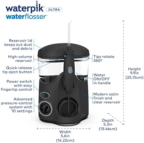 The Waterpik Ultra Countertop Water Flosser provides excellent water flossing performance. And it's great for anyone with braces, implants, crowns, bridges, or periodontal pockets. The Waterpik Ultra Water Flosser features 10 pressure settings, a contemporary design, a covered reservoir with in-lid tip storage, 6 specialty tips, and a water On/Off switch built into the handle to easily control water flow. The Waterpik Ultra water flosser removes up to 99.9% of plaque bacteria that causes gingivitis, cavities, and bad breath from treated areas and is clinically proven up to 2X as effective as string floss for removing bacterial plaque and improving gum health. Waterpik is the #1 water flosser brand recommended by dental professionals, and the Waterpik Ultra water flosser is accepted by the American Dental Association (ADA) for safety and effectiveness. Backed by a 3-year manufacturer's limited warranty, see product manual for details.
