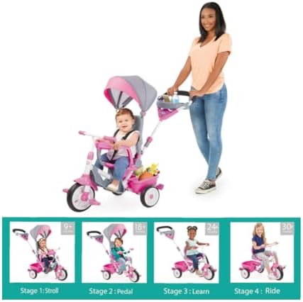 The Perfect Fit 4-in-1 Trike is ready to grow with your child! With all of the features of your favorite stroller, this trike is not only a perfect fit for your child – it's a "perfect fit" for parents too! This advanced trike makes on-the-go travel easy with multiple storage spots! From parents pushing, to toddlers learning to pedal, to them starting to steer, and then going on their own, this trike keeps pace with your active, growing child. Stage 1-Stroll (9+ months) Parents to push and control-When the foot platform is installed, the child will be unable to reach the pedals Stage 2-Pedal (18+ months) Toddlers can learn how to pedal, child is unable to turn the wheel Stage 3-Learn (24+ months) Remove the waist bar, child can steer while parent still has control with the push bar Stage 4-Trike (30+ months) Remove the push bar to let kids go on their own with parent supervision Product Features: • Pink 4-in-1 trike to grow with your child from stroller to trike • Full shade canopy to protect child from all angles • High-back seat for comfort and safety • Adjustable seat with the flip of a switch • Full foot platform fully protects little feet • Large parent storage bucket and bottle holder • Safety-bar with cup/snack holder • Ages: 9+ months.