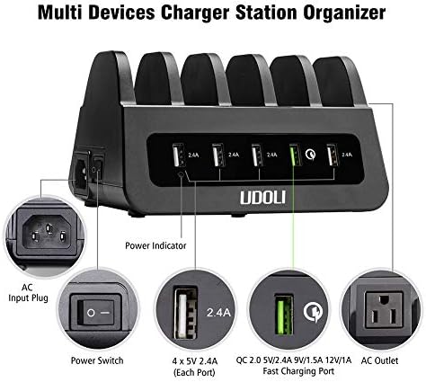 - 【Compact Charging Stand All in One】: 5 ports USB station ( 4 x 5V 2.4A each port USB A ports ,1 x QC 2.0 5V 2.4A/ 9V 1.5A/ 12V 1A , 60W Total) plus 2 standard AC outlets. The smart chipset of the charging station for multiple devices prevents overcharging and overheating.